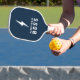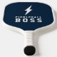 This simple, trendy pickleball paddle features a lightning bolt and collegiate typography reading Pickleball Boss. The back contains text templates for monogram initials and a name, making it a perfect, personalised gift! The background colour can be customised to any colour you'd like!