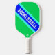 This sporty design features bright aqua stripes highlighting a vivid royal blue diagonal centre racing stripe filled with big white block letter typography that spells out PICKLEBALL. Adjoining bright lime background colour completes the composition.