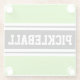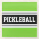 This fun sporty design features bold block letter PICKLEBALL text inside a highlighted wide black stripe with double white stripes against a bright lime green background.