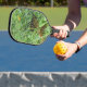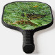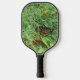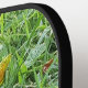 A Black, Pickleball Paddle, (Standard), with a cover=(optional)=can change under change options, with a Beautiful Picture of a Monarch Butterfly, laying in the Grass, on it, Picture reversed on the back of Paddle, (Picture by P.J.M.), with an Official USA Pickleball Certification in the Colour white, on it.