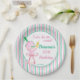 Pickleball pink and green birthday party personalised printed paper plates template, pickleball racket martini glass adults party monogrammed paper plates, modern bow ribbon coquette pickleball party personalised table decor printed paper plates