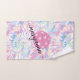 Custom printed pickleball sport hand towel with pink tie dye background pattern and handwritten cursive calligraphy script name with tails on the letters.