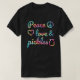 A groovy t-shirt featuring the phrase "Peace, love and pickles". The lettering and graphics have a tie-dye effect. Great for pickle lovers.