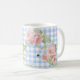A classic American blue gingham background over laid with lovely , fresh pink garden roses.