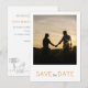This save the date card is the perfect blend of modern and casual, with a black and white minimalist theme accented by a pop of orange. The front of the card provides the opportunity to showcase a special image, adding a personal touch to the announcement of your upcoming event. On the back, the casual and informal wording is complemented by simple typography in a charcoal colour, creating a relaxed and inviting feel. The addition of a minimal line art illustration featuring a couple holding hands with a golden retriever tied to a signpost adds a touch of charm and warmth to the overall design. This save the date card is a wonderful way to inform your guests of your special day in a stylish and heartfelt manner.