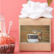 A picture of a chipmunk sitting on a latte coffee mug against a brick background. The coffee mug is black and white with white circles on the black background. The chipmunk is sitting on the mug with his curl tailed around the handle. There are appealing patterns of stripes and circles in this wildlife photograph. If you like chippies (or you like coffee!), you'll love this cute chipmunk picture which can be easily customised and printed on many different photo products. Join me in a cup of coffee?