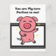 A cute doodle of a pink pig posing happily with sparkles surrounding it and it is so perfect that it is popping up of the camera film border. Caption reads "You are Pig-ture Perfect to me!" which is a play on the term "Picture Perfect". A funny and wacky cartoon to tease and put a smile on the recipient's face. Design by Rusty Doodle.