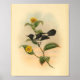 1875 vintage illustration of White Pied Flycatcher. With black and white feathers sitting on a tree branch with yellow flowers.