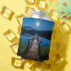 Can cooler with a beautiful photograph of a wooden pier stretching out over a calm lake.