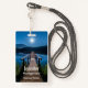A name tag with a beautiful photograph of a wooden pier stretching out over a calm lake.