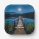 Paper plates with a beautiful photograph of a wooden pier stretching out over a calm lake.
