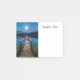 Sticky notes with a beautiful photograph of a wooden pier stretching out over a calm lake.