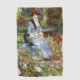 Pierre-Auguste Renoir - Dans les Roses. Cute portrait of a young woman in warm colours. A girl sits on a bench in a shady madu. Flowers grow nearby. There are tall trees behind her. Reproduction of famous works of art images in the public domain.