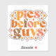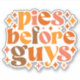 This fun and cheeky fall-themed design features the playful phrase "Pies Before Guys" in a bold, retro-inspired font. The text is arranged in a compact, stacked layout with each word in a different font style, creating a dynamic and eye-catching composition. The colour palette includes warm autumnal hues like deep oranges, rich browns, and golden yellows, perfectly capturing the cosy vibes of the season.