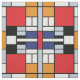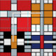 This oil on canvas from 1920 shows a composition with black, red, grey, yellow (orange), and blue blocks in a style that came to be known as De Stijl or Neo-Plasticism.