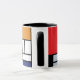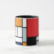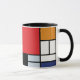 This oil on canvas from 1920 shows a composition with black, red, grey, yellow (orange), and blue blocks in a style that came to be known as De Stijl or Neo-Plasticism.