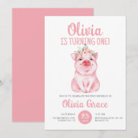 Cute Hot Pink Farm Baby Pig Girl 1st Birthday Invitation