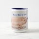 A cute chubby pig with a robin perched on his snout is wishing a- Happy Day to you! A funny mug/present for all pig and bird lovers! Original painting by international artist, Jan Law