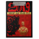 In a square are 2 pigs: one (black papercut Chinese style) seems to come sniff a golden papercut shape (inside is the second pig with the Chinese symbol). Behind them there is a red background formed by large decorative and ornamented letters with the words: "Pig Year" and at the top "Year of the Pig" + large 2019. Design on clipboard with black background. You can easily change year (font, colour, size and position) by clicking the customise button. Matching office products, home products, greeting card, postcard, craft products and more. Perfect for Chinese New Year 2019 of the Pig or birthday (people born in the Pig year).