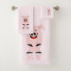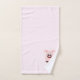 Bath towel set, consisting of a face cloth, hand towel and bath towel with a pig design. You can have this bath towel set in any colour by changing the background just click the edit this design button and choose the colour of your choice. You can also customise the text to read whatever you want. Should you require any help with customising then contact us through the message link on this page. Pig design bathroom towel set