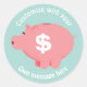 Cartoon piggy bank on round stickers to custom with your own text. (you can also customise background colour)
