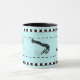 The trio of pilates figures circle a mug in black and white with a checked border. Background colour can be customised.