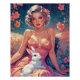 A stunning illustration of a pin-up in a floral pink gown, holding a cute white bunny. Her retro hairstyle, adorned with pink flowers, complements the lush floral background in teal and pink hues, capturing the charm of Easter with vintage elegance.