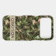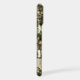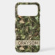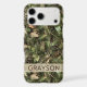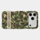 Customize this pine and leaves camouflage iPhone 17 pro max case with your name in a trendy modern CAP font in brown on opaque cream. It's masculine and perfect for your favorite military, hunting, country or outdoorsman!