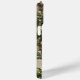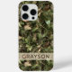 Customize this pine and leaves camouflage iPhone 15 pro max case with your name in a trendy modern CAP font in brown on opaque cream. It's masculine and perfect for your favorite military, hunting, country or outdoorsman!