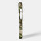 Customize this pine and leaves camouflage iPhone 15 pro case with your name in a trendy modern CAP font in brown on opaque cream. It's masculine and perfect for your favorite military, hunting, country or outdoorsman!