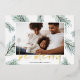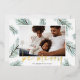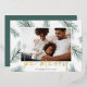 A modern and elegant holiday card design featuring your favourite landscape orientated or horizontal photo surrounded by spruce green watercolor pine boughs and Christmas greenery. "Be Merry" appears beneath in gold foil handwritten lettering. Personalise with your family name along the bottom.