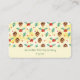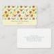 Business cards with a cute pattern featuring pine cones and holly on a yellow watercolor background with little white circles scattered around.