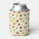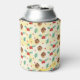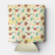 Can cooler with a cute pattern featuring pine cones and holly on a yellow watercolor background with little white circles scattered around.