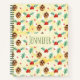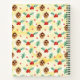 Spiral notebook with a cute pattern featuring pine cones and holly on a yellow watercolor background with little white circles scattered around.