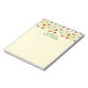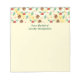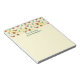 A notepad with a cute pattern featuring pine cones and holly on a yellow watercolor background with little white circles scattered around.
