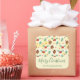 Merry Christmas stickers with a cute pattern featuring pine cones and holly on a yellow watercolor background with little white circles scattered around.
