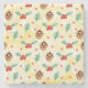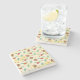 A stone coaster with a cute pattern featuring pine cones and holly on a yellow watercolor background with little white circles scattered around.
