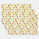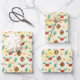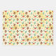 Wrapping paper sheets with a cute pattern featuring pine cones and holly on a yellow watercolor background with little white circles scattered around.