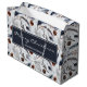 Large gift bag with a beautiful pattern. Pine cones, feathers, pine needles and berry sprigs. Rustic watercolor design. Merry Christmas and a personalised name written in a dark blue frame in the centre.