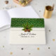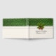 Winter wedding themed guest book done in an antique ivory with graphics of a green and gold pattern at the top and an ivory lacy ribbon, across the middle. Graphics of a pine sprig with pine cones, decorates the middle front. Personalise the text fields for your special day. Matching wedding products are available.