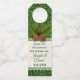 Winter themed wedding bottle hanger with graphics of an antique ivory text area bordered with ivory lace on a gold and green swirl background. A lovely sprig of pine with pine cones, decorates the top of the hanger. Personalise the green text for your wedding. Matching wedding products are available.