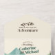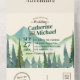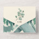 The deep forest green and emerald green colours used in the design give it a natural, rustic feel, perfect for a backwoods country wedding or a nature camping adventure. With towering mountain pine trees in the background, this design is sure to transport you and your guests to a serene forest setting.