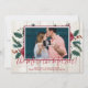 Photo Christmas Pregnancy Announcement Cards. Expecting parents! Modern red hand lettered typography script "the More the Merrier!" card to share your happy news with family and friends in the holiday season. Features watercolor burgundy white floral pine branches red berries with holly arrangement on light rustic wood background. Inside the frame you can change the photo for your own. You can personalise the design by replacing the texts and horizontal photo. #3347 If you need help or matching items, please contact to me!