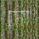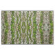 Stylish fabric features a bold repeating pattern of moss on bark. The aging pine tree bark has faded and lost some of its outermost layers. Vibrant green moss is growing in vertical grooves in the bark. The macro photograph shows the alternating stripes of bark and moss as well as the texture of each. The bark is layered, scaly, with fine gradations of colour: greys, browns, and even pale green. The moss is comprised of myriad short fine hairs, as though the tree wanted some green fur highlights.