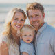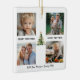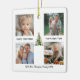 Watercolor Pine Tree with elegant gold bows in the center surrounded by personalized collage of 4 Photos, Family Name and year in Script calligraphy towards bottom. This is an Elegant, Modern, Holiday Christmas Ornament!