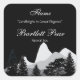 This elegant label is perfect for your candle making, food jar label, or other DIY project. The background is black. In the foreground there is an illustration of mountains and pine trees in shades of white and grey. Your text goes towards in the top.