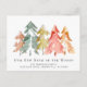 Simple and elegant moving announcement postcard featuring beautiful watercolor forest of abstract pine trees in muted green, red, gold and orange. On the front, personalise the "Our New Neck of the Woods" text, your family name and your new address. On the reverse side you can personalise your announcement in more detail and include telephone numbers and email addresses if desired.