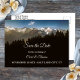 Save the Date postcard featuring a painting of pine trees with snow capped mountains. This postcard is part of a wedding collection.