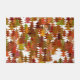 Subtly shadowed layers of pine tree cutouts in greens, reds, oranges, and browns on a white background