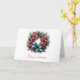Christmas card with a pretty Christmas wreath. A festive image with a pine wreath decorated with red flowers, holly and a lovely blue bow. Delightful.